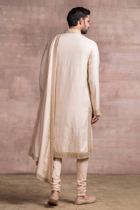 Gold asymmetrical sandwashed muga silk kurta with a zardozi & aari embroidered back drape. Paired with a stretched churidar.