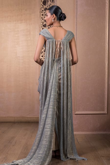Back tie-up detailing, Asymmetric attached drape, Crystal embroidered bodice