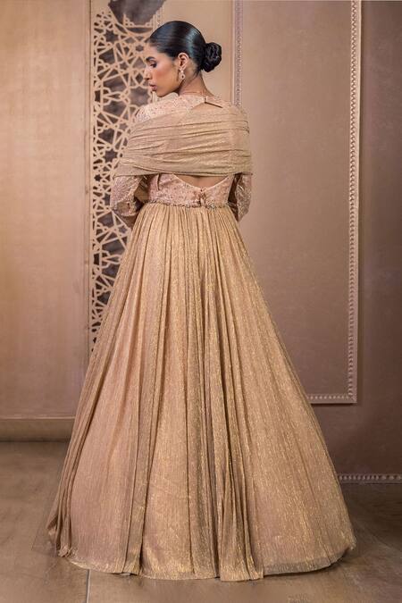 Champagne gold gown featuring a sweetheart neckline and full sleeves. Designed with an attached cape, crystal embroidery, and back cut-out detailing.