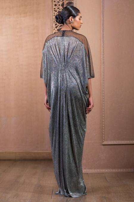 Black and silver gown featuring crystal embroidery and a cinched waist. Made from crinkle tulle with sheer panels on the sleeves.