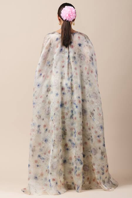 Multi-color sheer silk long cape with all-over print highlighted with crystals. Comes with floral motif bandeau crop top & wide-legged pants.