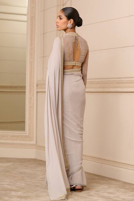 Buy_Tarun Tahiliani_Grey Lace, Silk, Chiffon Lace, Tassels Scoop Neck Saree With Work Blouse_Online_at_Aza_Fashions