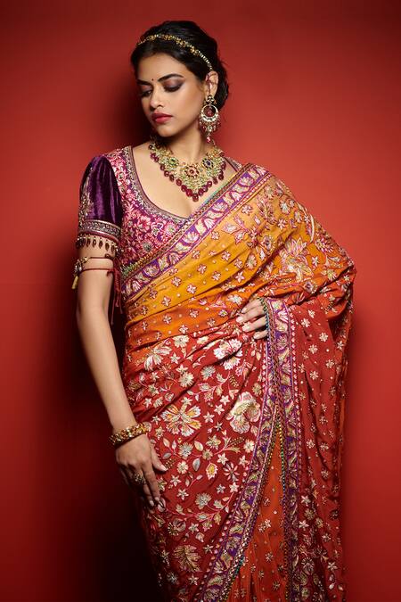 Sunset ombre saree with digital print and kasheeda floral motif hand embroidery. Comes with dupion silk contrast blouse & satin lycra petticoat.