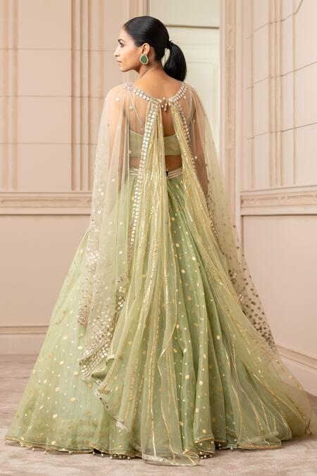 Jade asymmetric organza brocade lehenga with an under-layer of chevron borders. Paired with a textured bustier with fringe embellishment. Comes with a sheer cape with square-cut gota embroidery and gota-lined wings extended in the back.