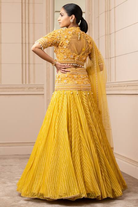 Mustard kalidar lehenga in sheer brocade, uplifted with resham embroidery on the hip yoke. Paired with a matching embroidered blouse with lifted floral motifs all over, laced with crystals and fringes on the hem. Comes with tulle dupatta with resham flowers, crystal and fringe embellishment.