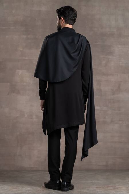 Black kurta in silk georgette fabric that is constructed with a detachable drape and is uplifted with jaali and Swarovski detailing. Paired with cigarette pants.