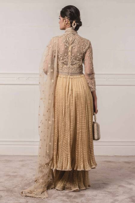 Gold anarkali with all-over floral motif dori worked bodice, crinkled texture & sheer sleeves. Comes with pants & embellished dupatta.