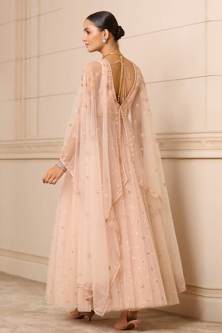 Blush pink overlay anarkali featuring a V neck and embellished with crystal work. Paired with a matching churidar in stretch net fabric.