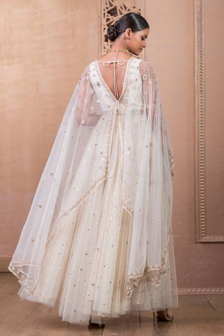 Ivory embroidered tulle overlay anarkali featuring a V neck and sheer overlay. Paired with a matching churidar made of stretch net fabric.