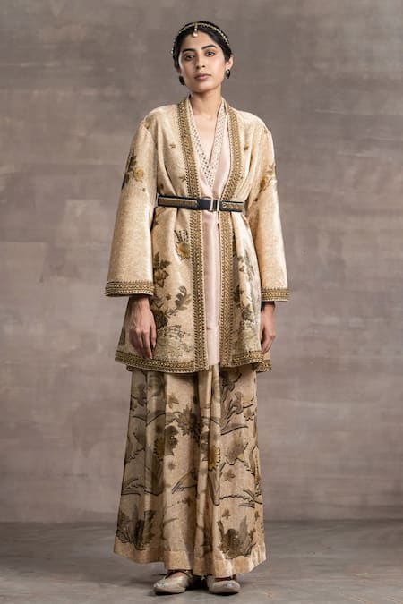 Gold printed jacket in velvet base, highlighted with embroidered braids. Paired with an embellished V-neck kurta in Chinese dupion base & printed wide-leg trousers.