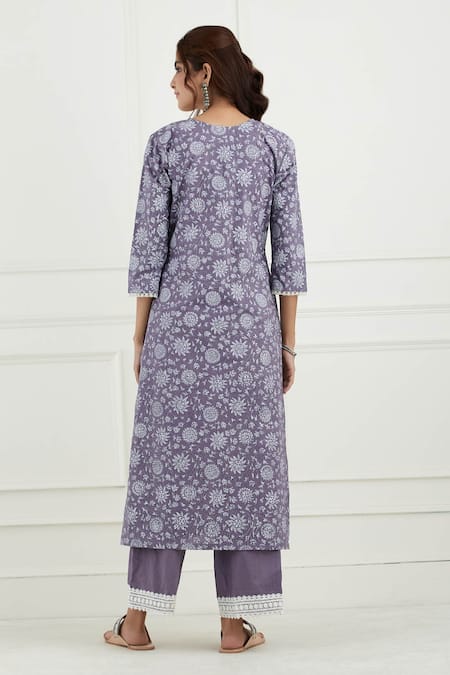 Purple cotton kurta with floral block print & lace border detailing. Paired with cotton pant & dupatta.