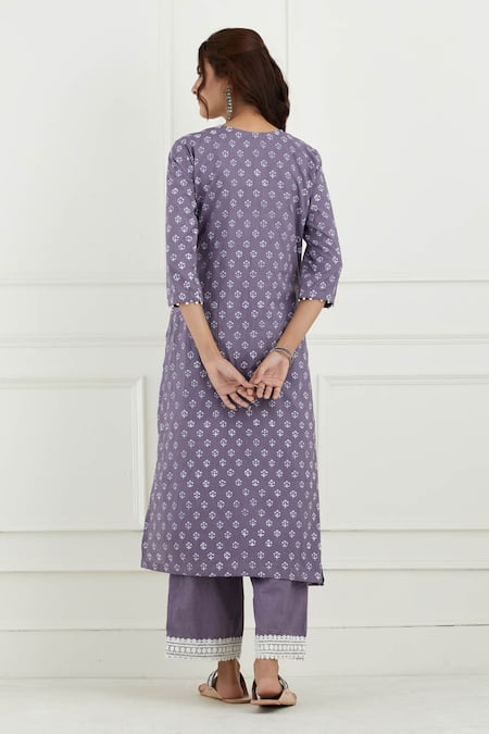 Purple cotton kurta with floral block print & potli button detailing on hem. Paired with pant & dupatta.