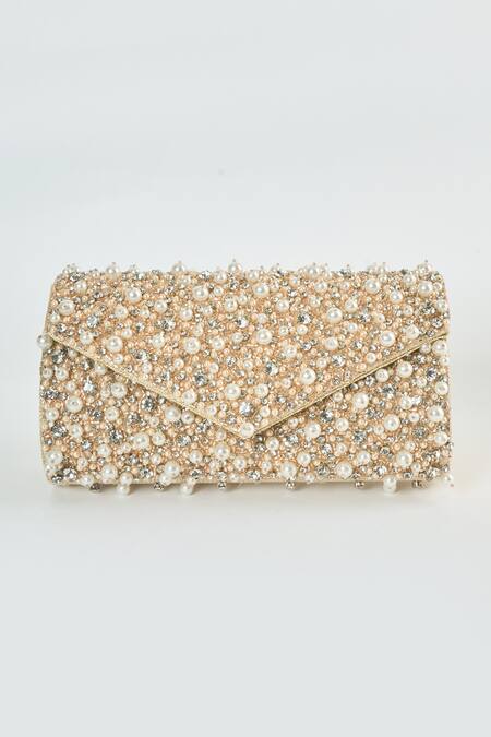 Rose gold clutch featuring all-over tonal cutdana, pearls, and stone embellishments