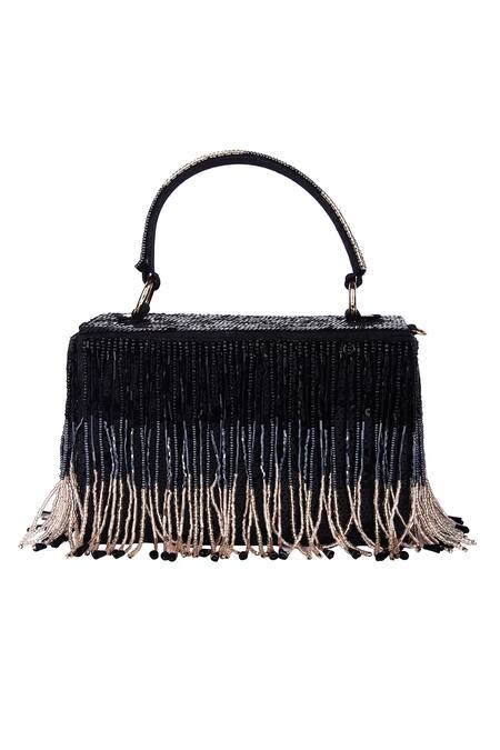 Black rectangle shaped clutch featuring tassel embroidery and a round handle