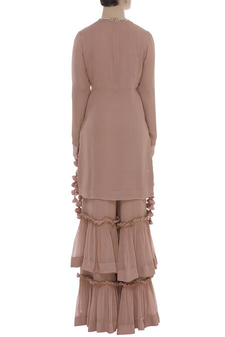 Beige Tassel Pearl Embroidered Kurta Sharara Set