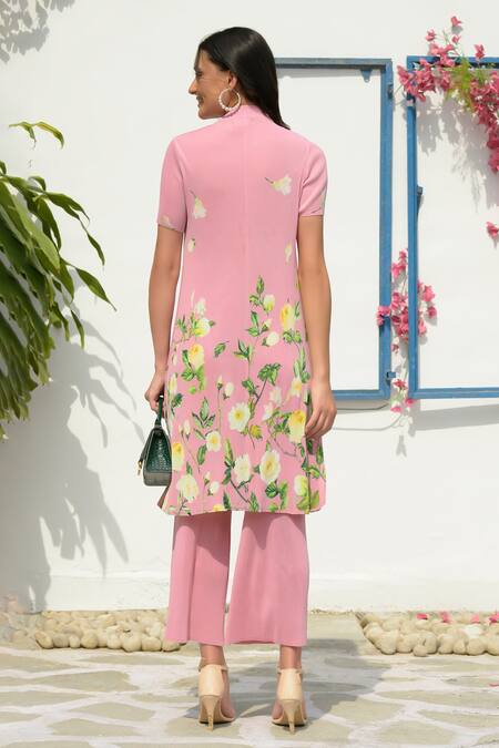 Pink Polyester Mandarin Collar Fable Floral Dream Print Shirt Tunic With Pant