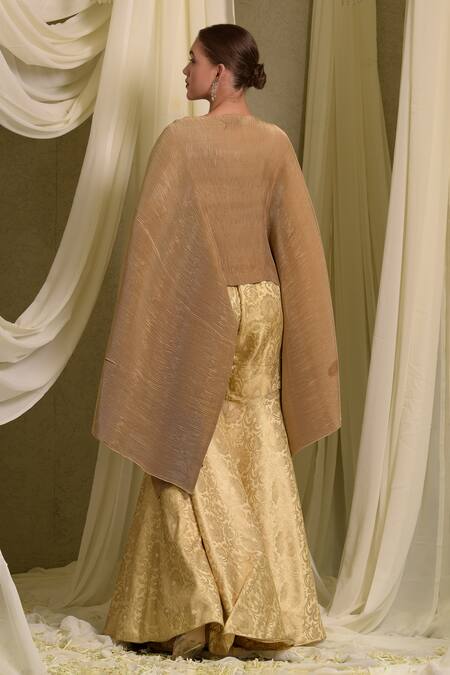 Gold batwing sleeves asymmetric cape featuring accordion pleated details and phool applique embroidery on the boat neckline. Paired with a floral brocade flared sharara pant.