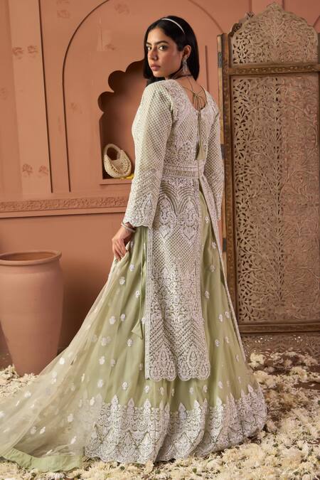 Sage green embroidered long jacket lehenga set featuring intricate sequins net fabric. Includes a matching dupatta with detailed embellishments.
