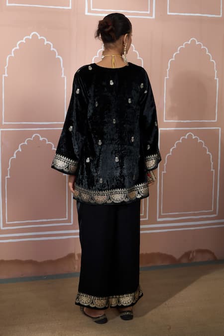 Buy_Tasuvure Indes_Black Velvet Embroidery V-neck Floral Tunic And Pant Set_Online_at_Aza_Fashions