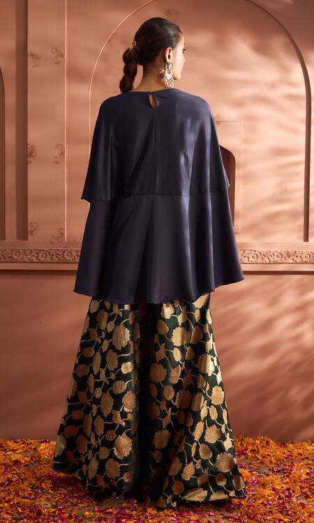 Blue Brocade, Silk Embroidery Round Neck Kiri Kaftan With Floral Veil Pant
