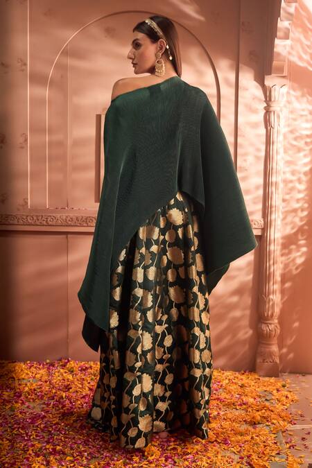 Green cape featuring pleat detailing and floral lace neckline with slit sleeves. Paired with a lotus motif detailed kalidar lehenga.