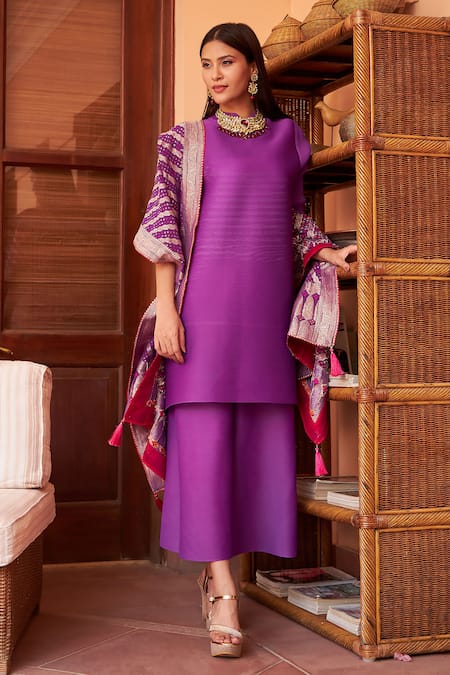 Purple bandhani pattern kurta in pleated polyester featuring a mandarin collar and three fourth sleeves. Paired with culottes pant and a tassel hem dupatta.