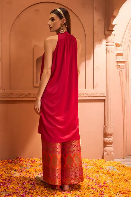 Red kurta featuring a band collar and floral applique embellishments. Paired with coordinating woven floral patterned flared pant.