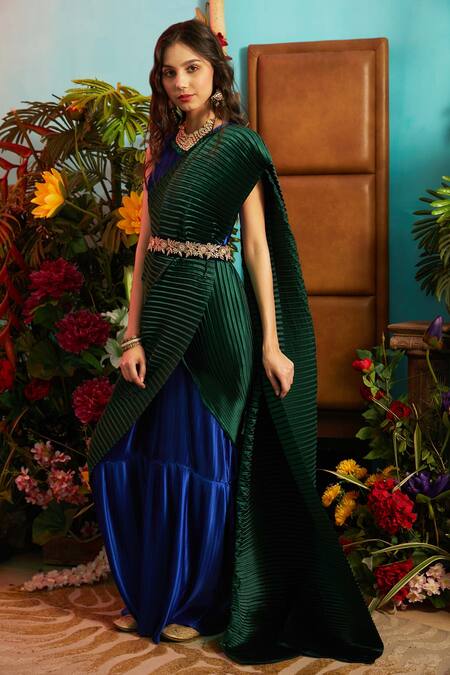 Emerald green, electric blue saree gown with pleated, draped pallu & round-neckline.
