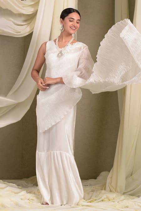 Buy_Tasuvure Indes_Ivory Organza, Polyester Round Neck Pristine Accordion Pleat Saree Gown_Online_at_Aza_Fashions