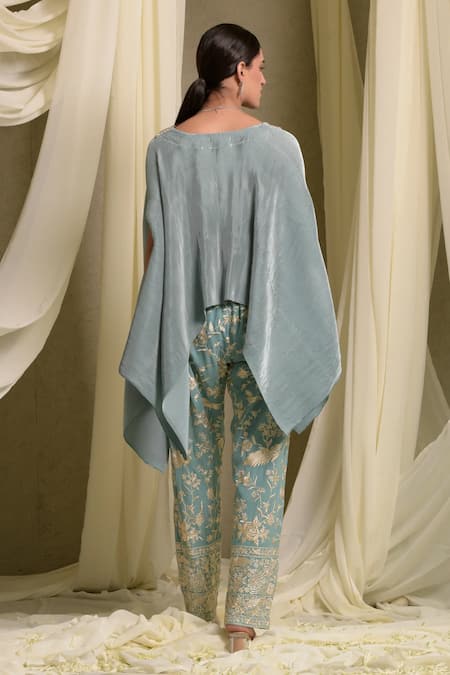 Mint blue cape featuring accordion pleats and floral gara embroidered neckline. Paired with a botanical pattern gara embroidered straight pant.