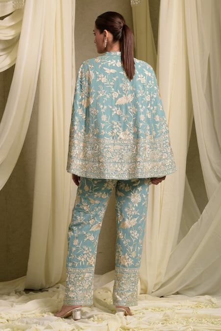 Mint blue cape jacket featuring gara embroidery in floral pattern with cape sleeves. Paired with an embroidered pant.