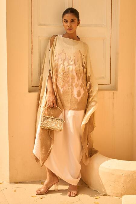 Beige slip dress with an ombre cape featuring intricate patterns. The cape adds a layered effect to the overall look.