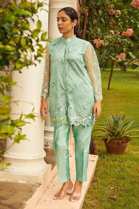 Buy_Tasuvure Indes_Green Satin, Silk, Net Applique, Pearls Floral Embroidered Tunic And Pant Set_at_Aza_Fashions