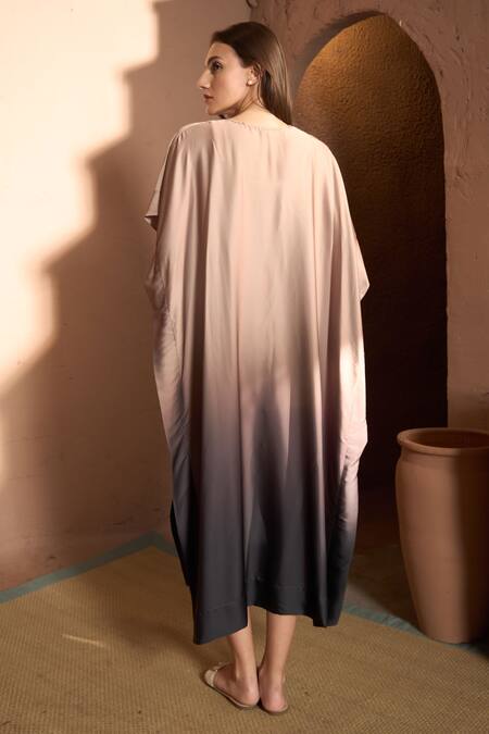 Muddy ombre effect kaftan featuring an embroidered bodice adorned with pearls and tassels