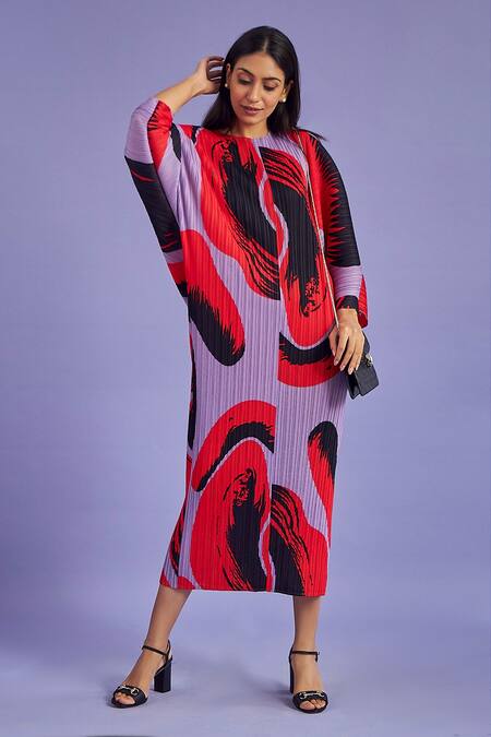 Purple Pleated Fabric Abstract Print Round Wesley Dress
