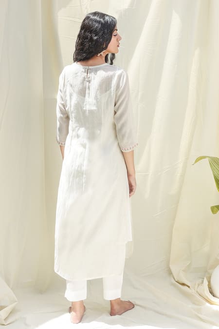 Ivory handloom chanderi kurta featuring multi-colored resham, golden zari taar, sequins, and kantha hand embroidery on cuffs and yoke. Paired with viscose silk pant and a sleeveless slip, it includes side slits on the kurta.