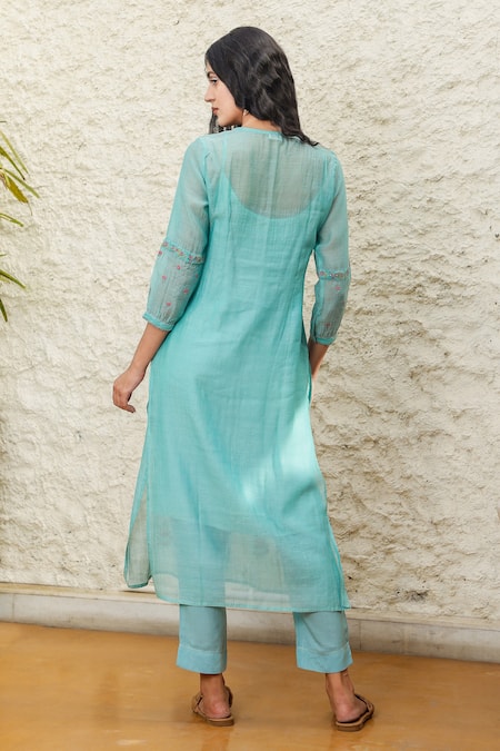 Teal blue handloom chanderi kurta featuring multi-colored resham, golden zari taar, sequins and kantha hand embroidery on the frilled yoke. Paired with viscose silk pant and a sleeveless slip.