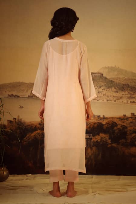 Ivory pink pintuck kurta featuring floral resham, zari, and sequin embroidery on the yoke. Paired with matching pant and slip.