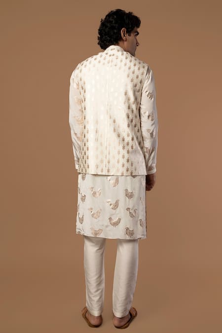 Ivory bundi with teardrop foil print & welt pockets. Paired with bird foil print knee-length kurta & pant.