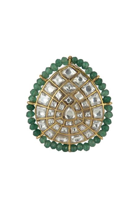Gold adjustable ring featuring a teardrop design adorned with light green beads and encrusted jadtar stones