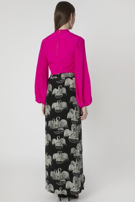 Black wrap skirt with all over printed swan motifs paired with a pink crop top. Comes with a unique eco friendly concept of bag attached to the skirt's hemline.