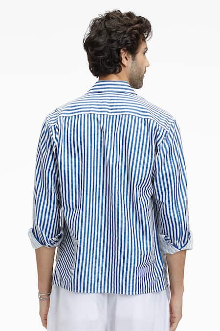 Blue and white shirt featuring an all-over bling stripe print and a collar neckline