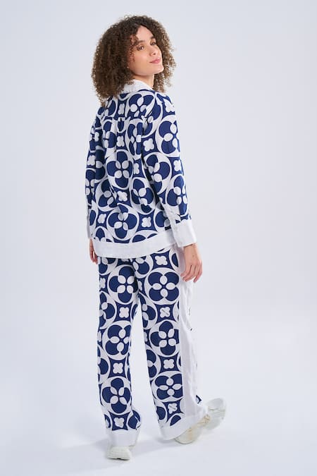 Blue pant featuring tonal crescent bloom geometric prints