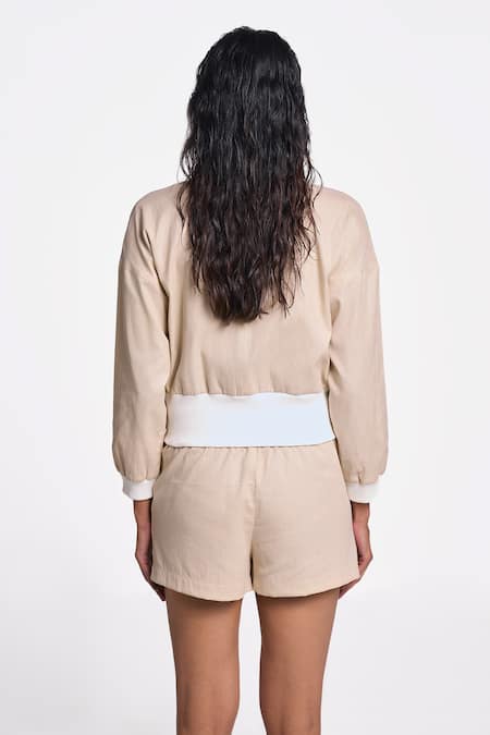 Beige solid bomber jacket crafted in 100% organic handloom cotton with side pockets and tie-up waist