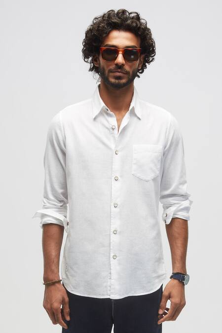 White soft collared shirt in organic handloom cotton base, rolled up sleeves & front buttons.