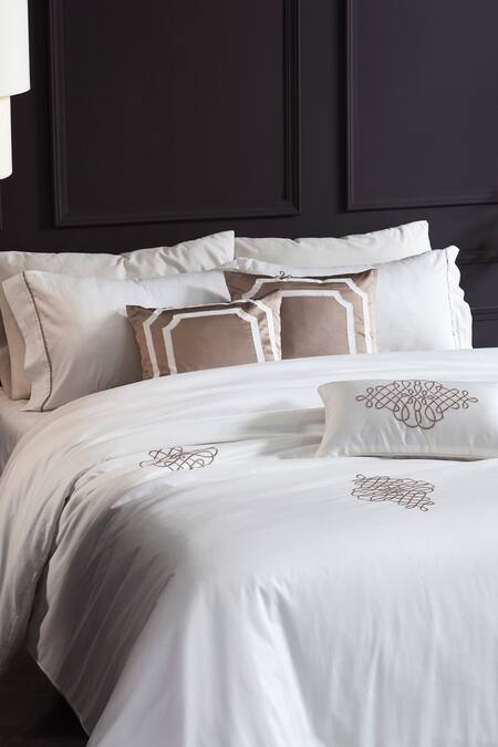 Rectangle shaped pillow covers, Square shaped cushion covers, Terrazzo embroidered motifs, Dimensions L x B (in inches):, Duvet Cover : 94 x 104, Deck Cover : 12 x 20, Pillow Covers: 18 x 28, Cushion Cover : 18 x 18, Weight (in kg): 13, Note: Only selling 1 deck cover, 1 duvet cover, 2 pillow covers and 2 cushion covers, filler is not for sale