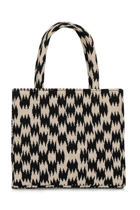 Black woven jacquard fabric tote bag featuring a box shape and textured abstract pattern