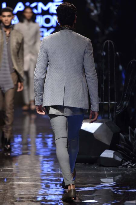 Blue tinted grey shirt kurta with textured bandhgala and pants.