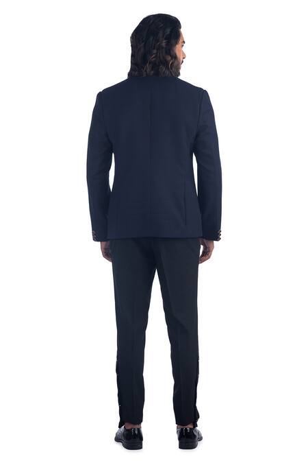 Navy blue bandhgala with textured pattern. Paired with pant.