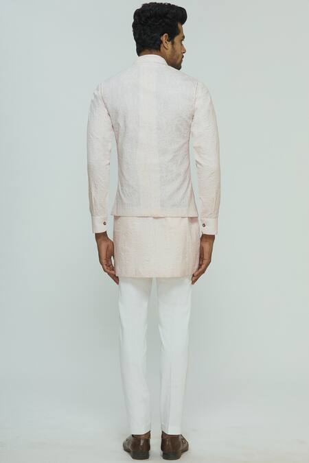 Blush pink short kurta with textured floral motifs. Comes with matching bundi & white trousers.